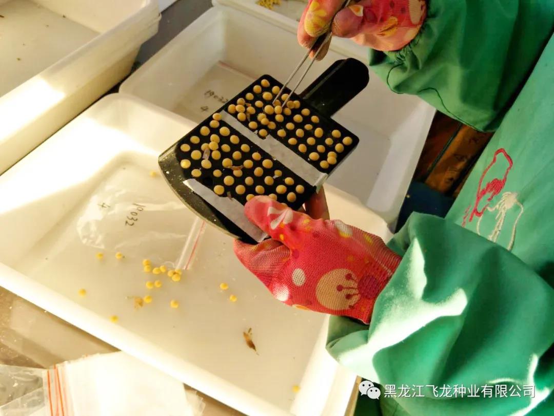 雜交育種是把不同品種間的優(yōu)良性狀綜合在一個(gè)新品種中,人為的創(chuàng)造變異。飛龍種業(yè)科研人員根據(jù)育種目標(biāo),選擇當(dāng)?shù)刂髟缘膬蓚€(gè)大豆品種進(jìn)行受體親本和供體親本雜交育種,再經(jīng)過世代的選擇、鑒定等一系列試驗(yàn),篩選出超親、優(yōu)質(zhì)、多抗、能夠適應(yīng)當(dāng)?shù)丨h(huán)境的高產(chǎn)新品種,最后進(jìn)行審定和大面積推廣。一個(gè)流程下來需要十二年的時(shí)間,期間不僅有著春種秋收,還有著冬種春收,科研工作的繁瑣和艱辛是可想而知的。