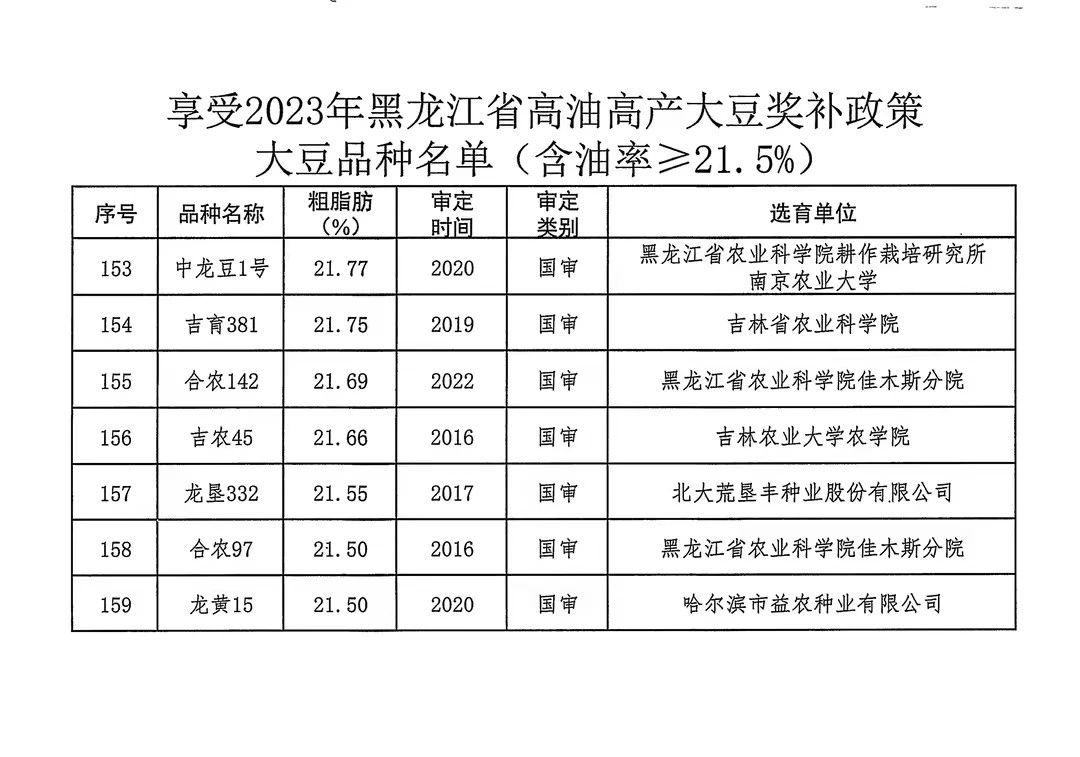 附件:1.享受2023年黑龍江省高油高產(chǎn)大豆獎補政策大豆品種名單(含油率≥21.5%)